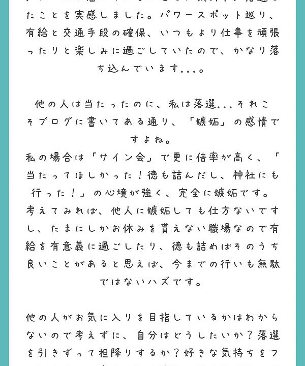 嫉妬の感情を常にMAXで持ち続けるのにも限界があるというか、時間がたてば当落日当日より低下していると思うし。一時的にボンっ!と嫉妬が大きくなることはあるとは思うけど、それもやっぱり時間が経てば落ちつくとは思います。