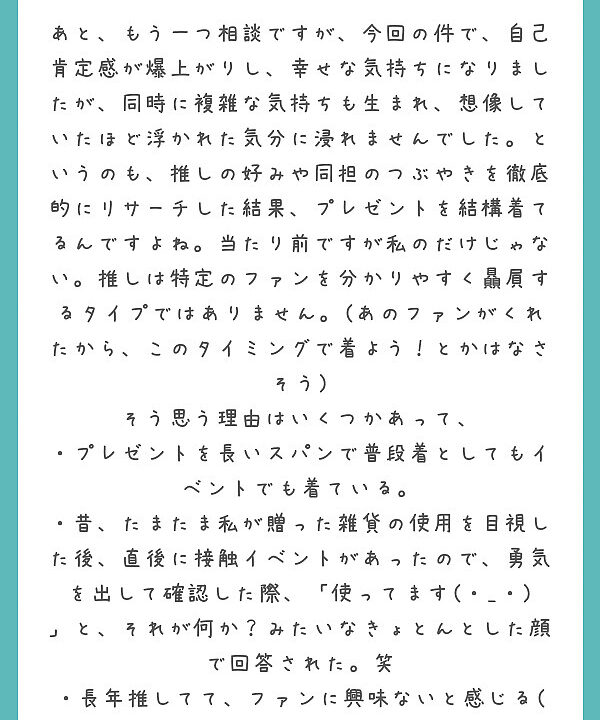 最後はちょっと厳しいかもですが、ご自身が嬉しかったことを素直に受け取って、その幸せを推しさんへフィードバックするのが一番平和だと私は思っています!