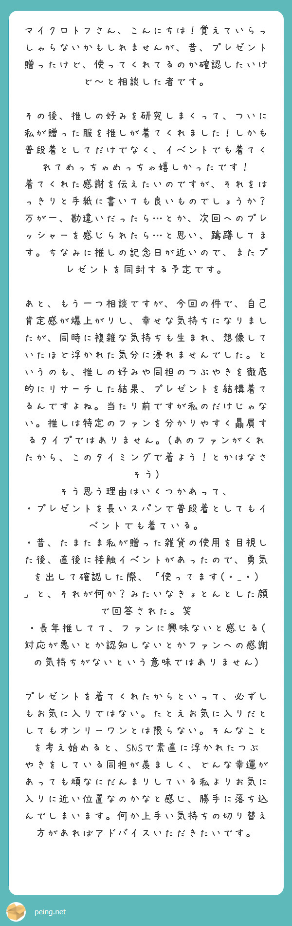 それで再度プレゼントを贈って推しがプレッシャーにならないか…ですが、おそらく自分以外からもたくさん送られてきているし、一回でも着てもらえたらテンション上がって「これも、あれもまた着てほしい!」と思って贈る人のが多いと思いますよ。