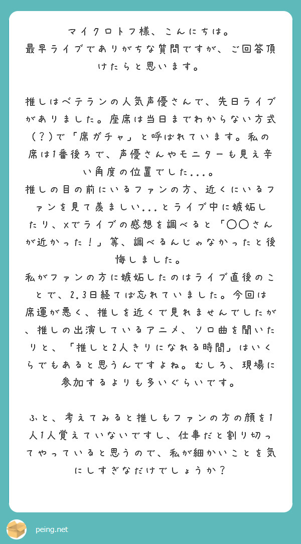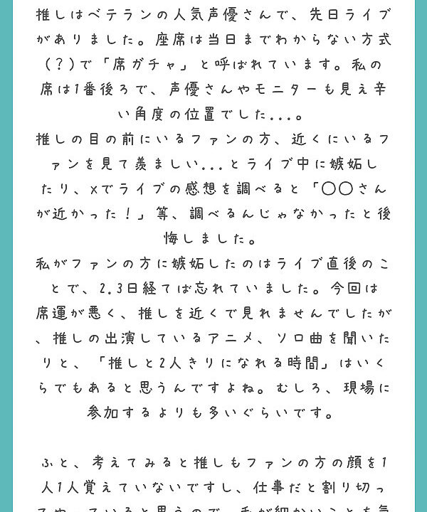 例えば、ライブでの席ガチャの件は本当にガチャなので自分がいい席の時もあれば悪い席の時もありますし、今回よかった席の方も次は悪い席かもしれません。