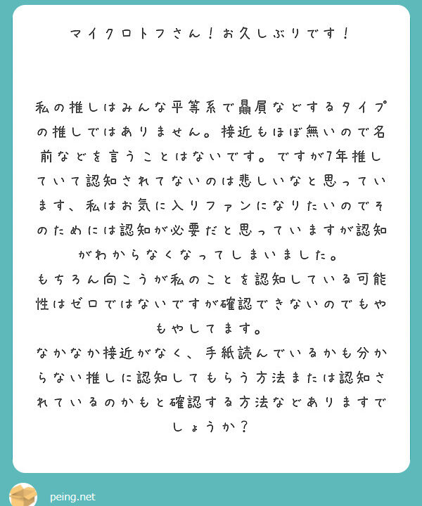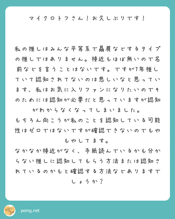 7年推してて認知されているか…というので、状況としては私がブログで追っかけてた推しと似たような状況なのかなー?と思いますが、私自身も明確に認知されている、という実証?はなかったですよ。