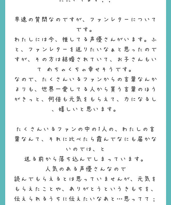 いただいたご質問内容だと、結婚してなくても独身でも、自分ではない大切な誰かが確実にいるだろうから、手紙送っても迷惑じゃない?というのと同じに思えてしまうので、やっぱり全然ファンレターは送っていいと思います!