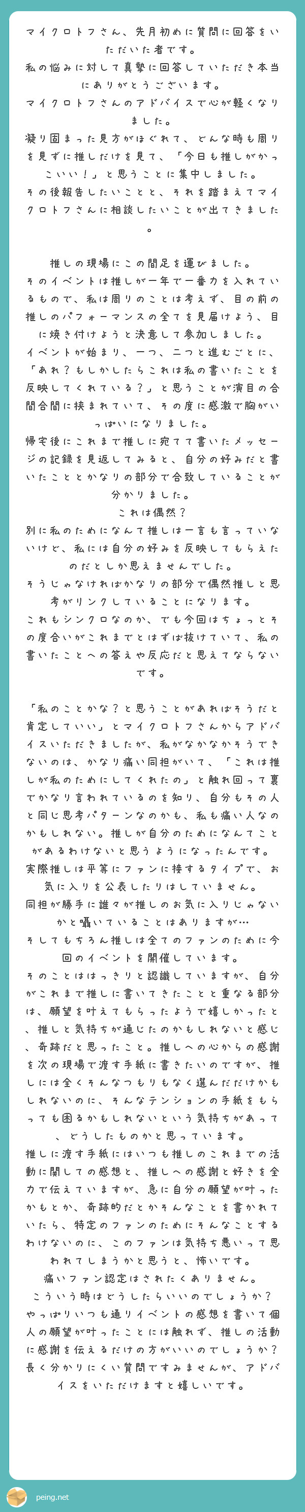 要するに、読んだときに引かれなければいいなーみたいな…まぁ、手紙を読んでくれてる推しの心の中ですら妄想しながら書いているので…それはそれで痛いかもしれないですね…💦