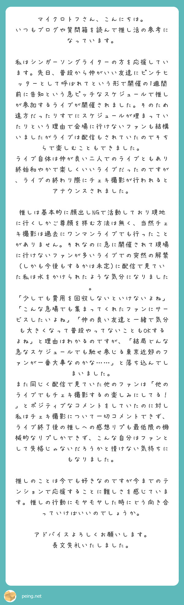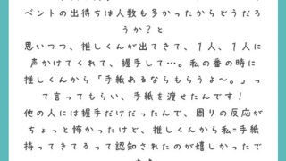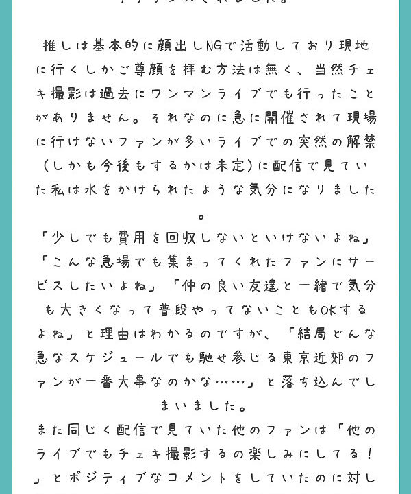 SNSでファンがめっちゃ騒いだらすごい気になるし、嫉妬しちゃうなーと思うし、その後もチェキ会してくれるタイミングなかったら、ちょっと冷めちゃう時期になってもしかたないなーと思いました。